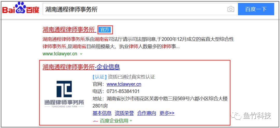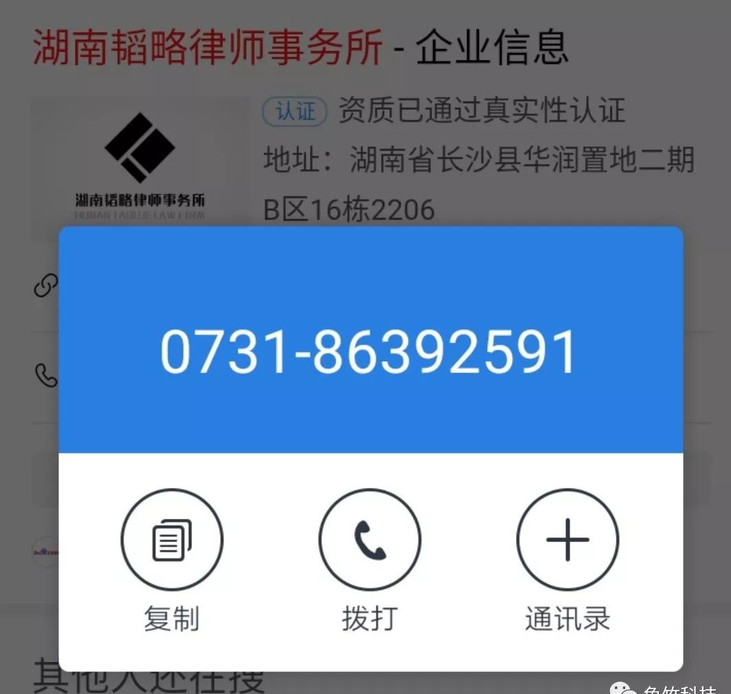 2、如下圖所示,百度企業(yè)名片可以實(shí)現(xiàn)一件撥號(hào),網(wǎng)民無需進(jìn)入網(wǎng)站就可以直接撥打電話聯(lián)系上律所;